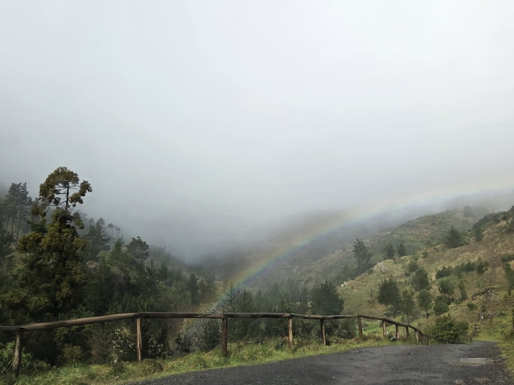 Was nun? Mit dem Mietwagen in den Innenstadt muss nicht sein. Gerald würde gerne einen Berg hoch, Nicole erinnert sich, dass ihr mal das "Forest Café" vorgeschlagen wurde, das liegt noch oberhalb vom Stadtteilt Monte. Viele Regenbogen begleiten uns auf dem Weg, jeder wird inzwischen frenetisch gefeiert. Das Navigationssystem Nicole hat wieder Tücken, Kilian nimmt sich vergnügt die Kopfhörer aus dem Ohr, "diese Comedy will ich doch nicht verpassen". Und es geht steile Wege nach oben, erst war es trocken, dann nieselt es, schließlich Graupel. Wir witzeln schon, ob es da wirklich ein Café gibt - aber tatsächlich. Im strömenden kühlen Regen bei 6 Grad wartet auf uns eine gemütliche Holzhütte mit leckeren Burgern.