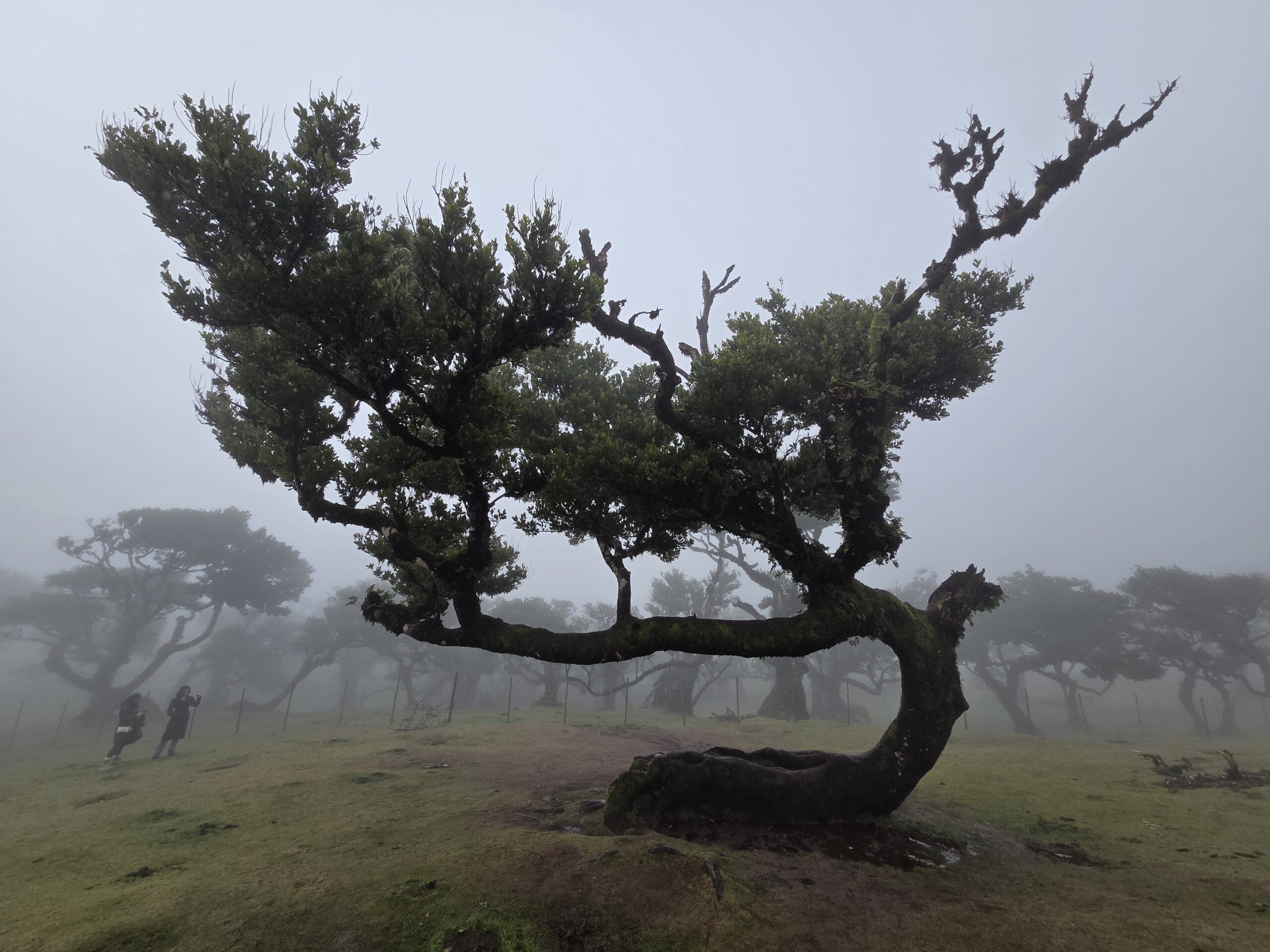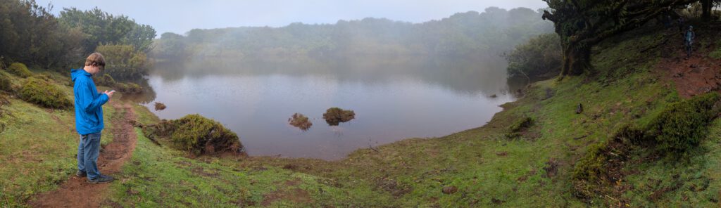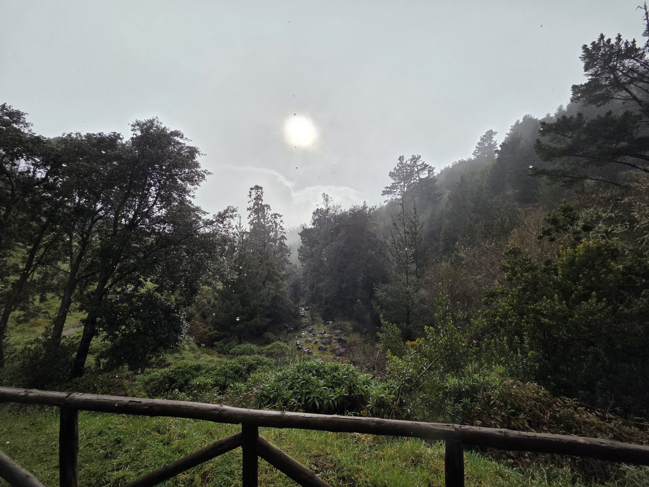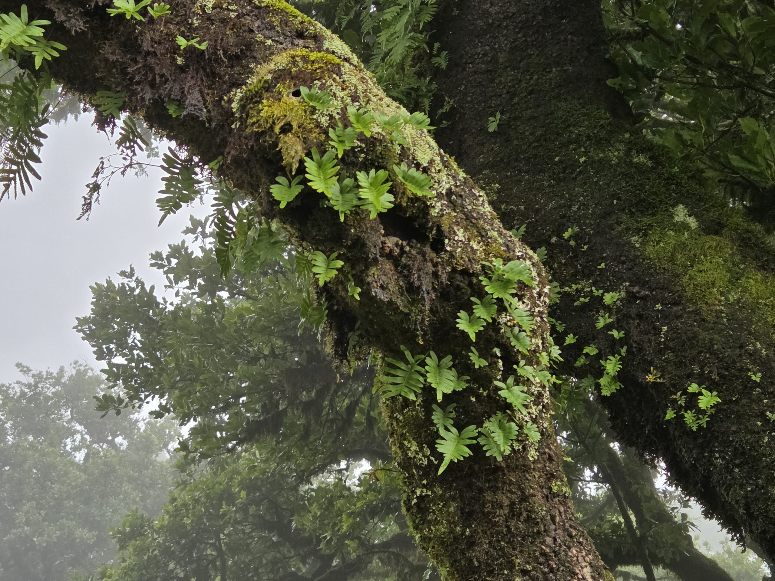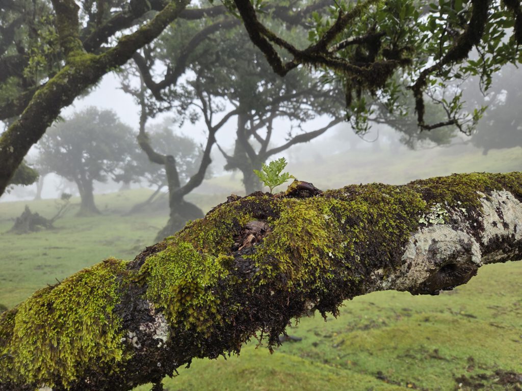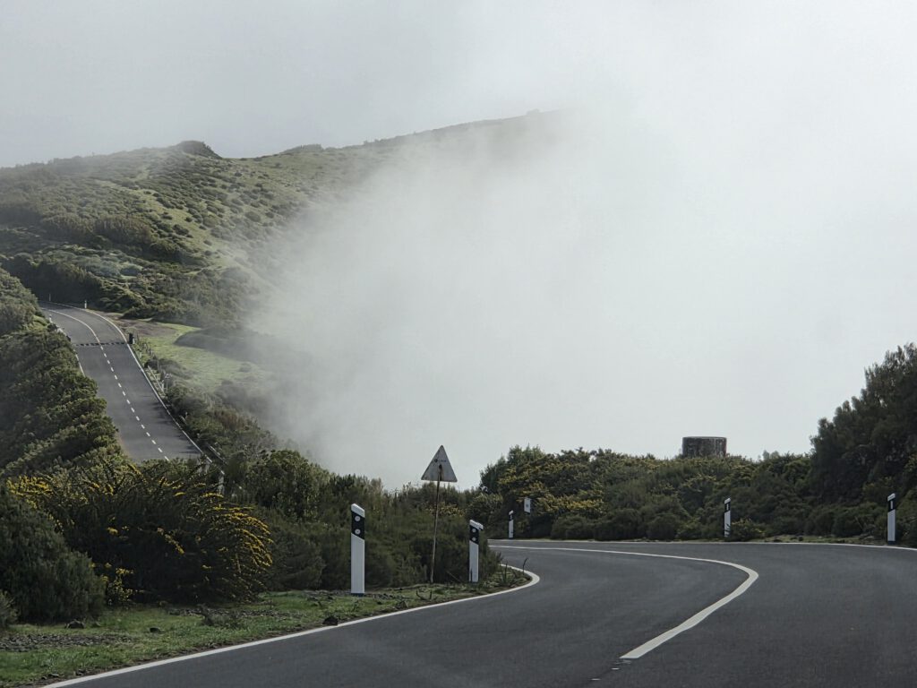 Danach steuern wir den sogenannten Nebelwald an. Diese Wanderwege gibt es schon lange, aber instagram hat für eine gewissen Popularität gesorgt. Auf der Hochebene wachsen Stinklorbeerbäume, die im meist vorhandenen Nebel für eine mystische Atmosphäre sorgen. Bei der 40 Minuten dauernden Fahrt gibt es vor allem viel Wolke. Und dann taucht ein vollgeparkter großer Parkplatz auf - das muss der Einstieg zu einer der beliebtesten Wanderungen der Insel sein, zu den 25 Quellen. Aber wir zuckeln im Nebel weiter, vorbei am offiziellen Einstieg in die Länge Wanderung - viele Autos - bis zum Start in die kleine Runde am Forsthaus. Auch hier viele Autos und der Nebel ist wirklich dicht.