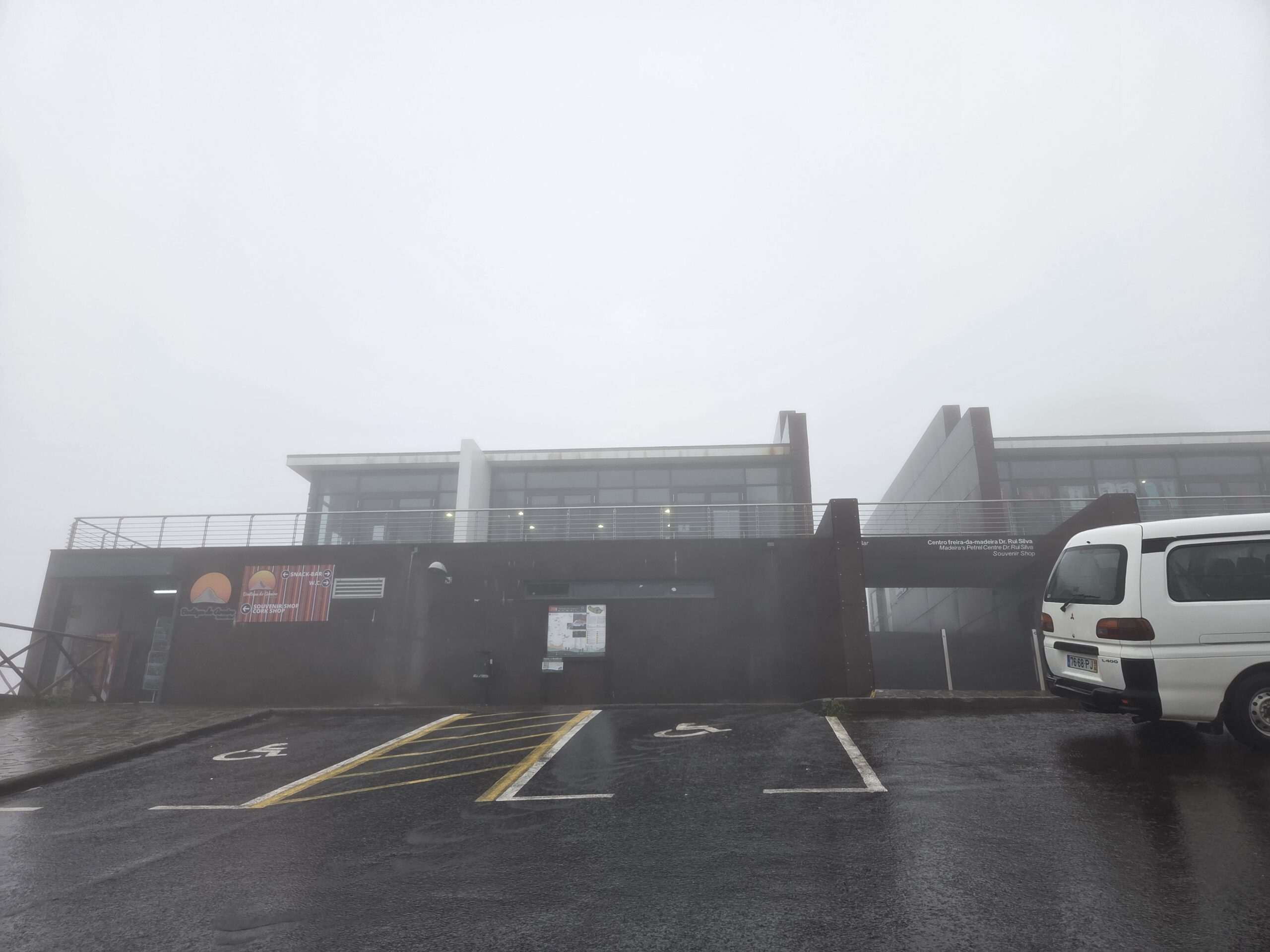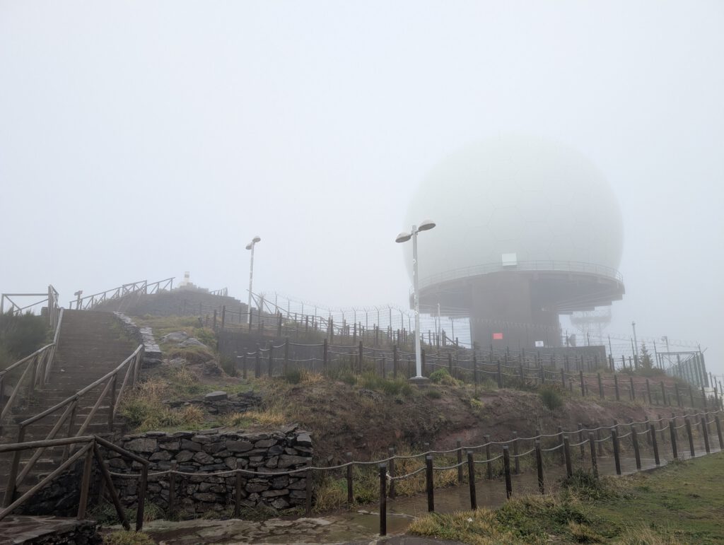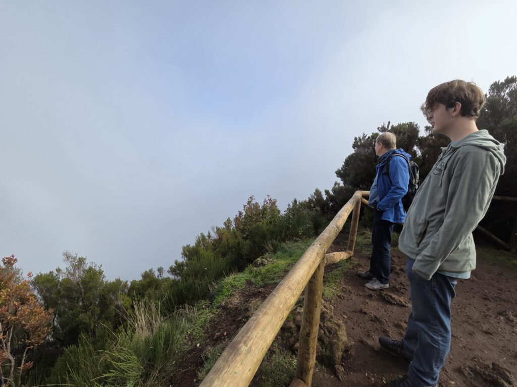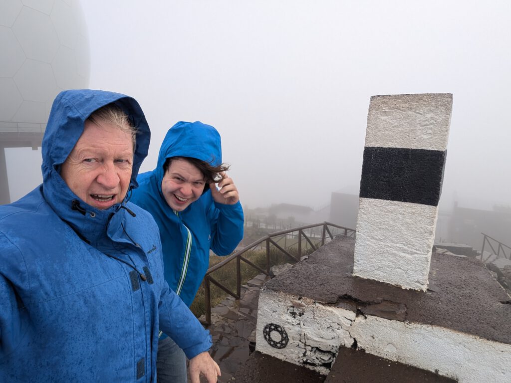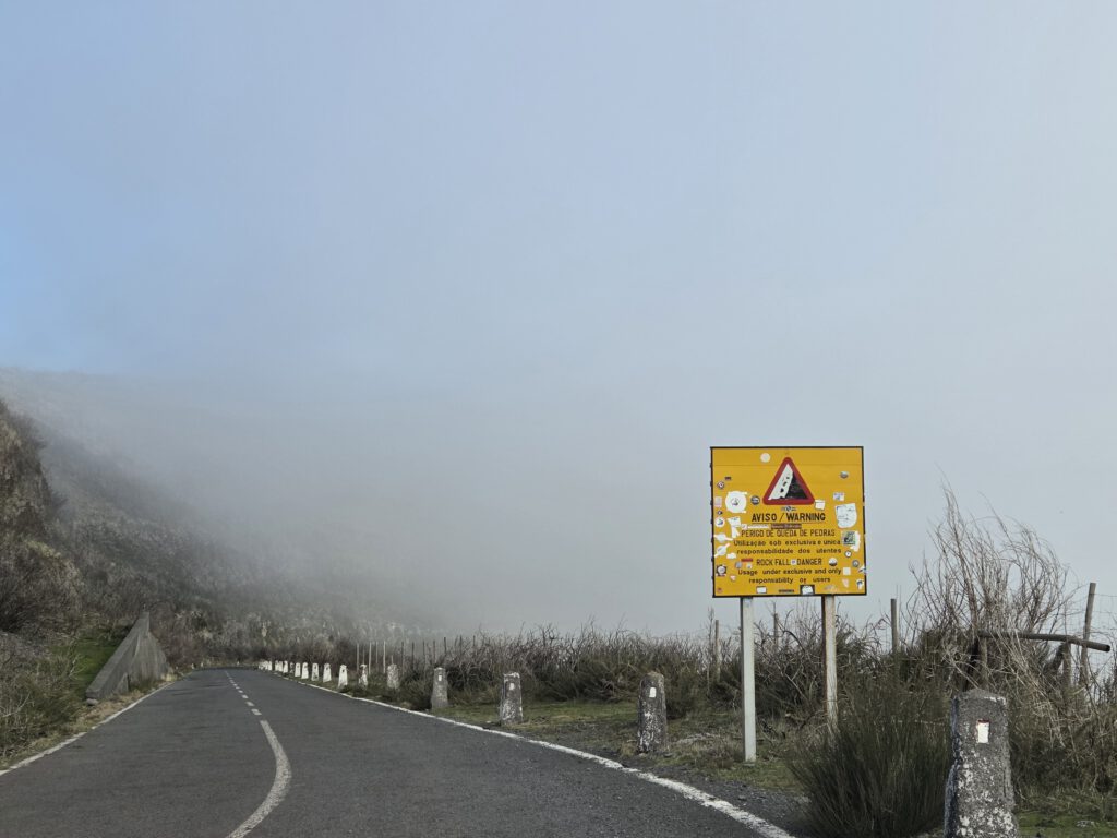 Und wo wir schonmal da sind, würde Gerald gerne wissen, ob der Pico do Arieiro, gut 1800 Meter hoch, eventuell über den Wolken liegt ... Wir fahren also nochmal einige gute Kilometer bergauf, durch immer dichteren Nebel und Dunst, das Thermometer zeigt irgendwann nur noch 2 Grad an. Aber, erstaunlich, auf dem Parkplatz unterhalb von Café und Gipfel stehen an die zehn Autos. Gerald und Kilian huschen kurz zum Gipfel und sichten sogar Wanderer. Louisa und Nicole ziehen das warme Auto vor ... Auf dem Weg nach unten reißt der Himmel wieder auf.
