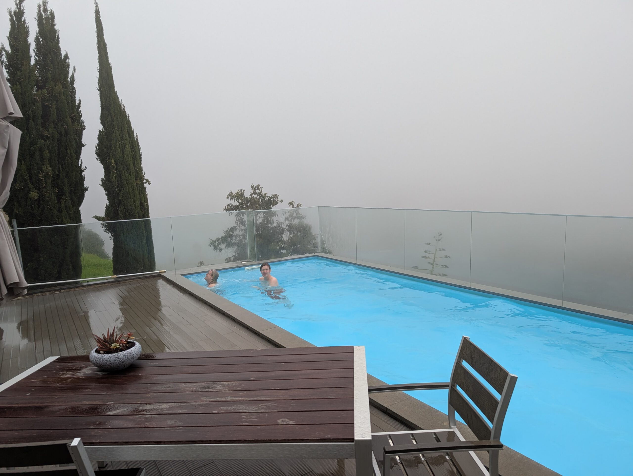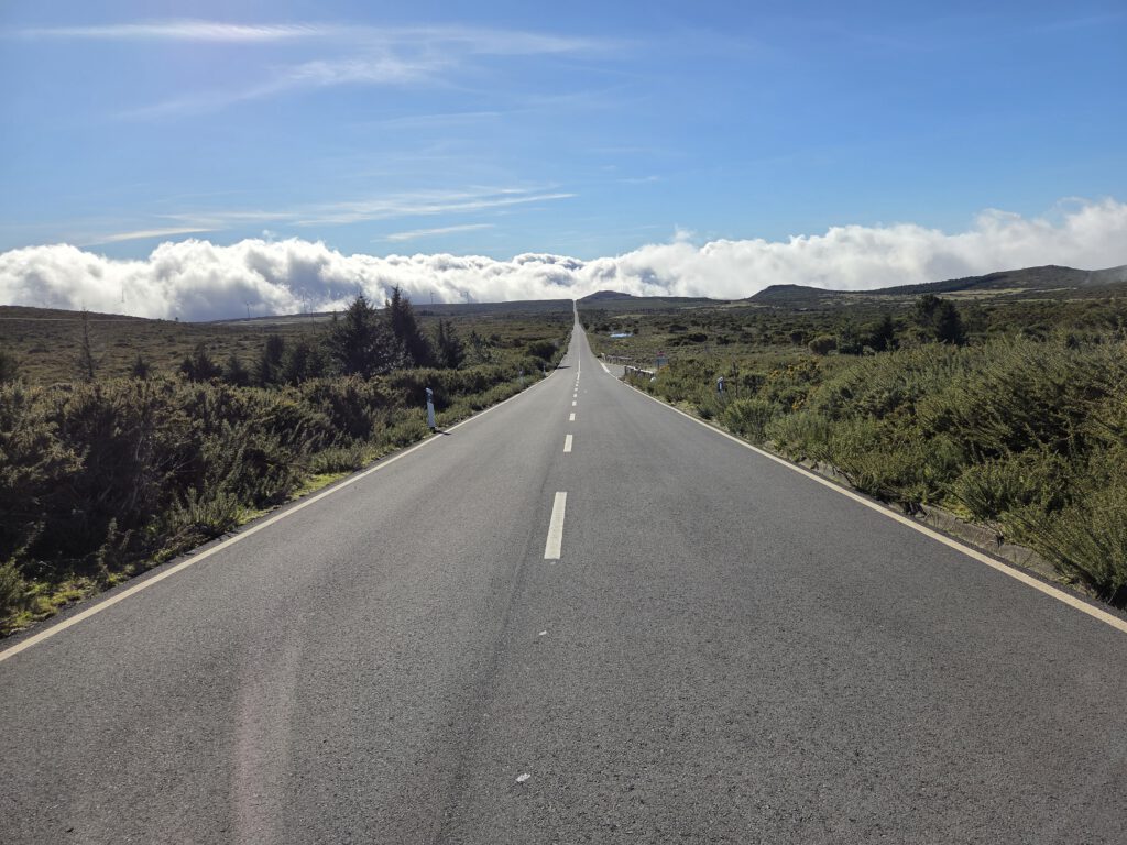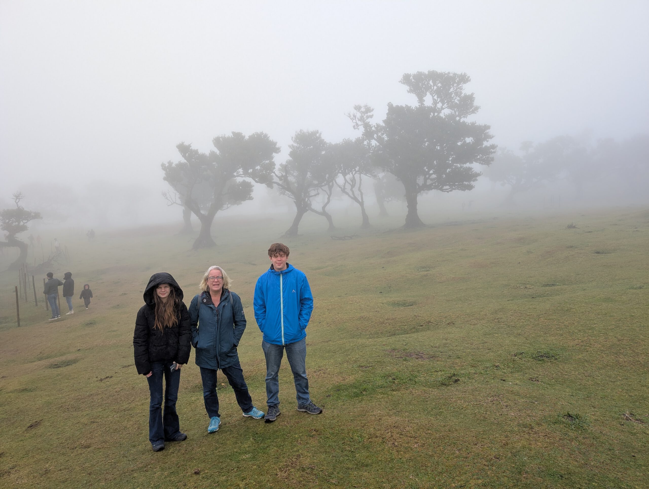 Und wo wir schonmal da sind, würde Gerald gerne wissen, ob der Pico do Arieiro, gut 1800 Meter hoch, eventuell über den Wolken liegt ... Wir fahren also nochmal einige gute Kilometer bergauf, durch immer dichteren Nebel und Dunst, das Thermometer zeigt irgendwann nur noch 2 Grad an. Aber, erstaunlich, auf dem Parkplatz unterhalb von Café und Gipfel stehen an die zehn Autos. Gerald und Kilian huschen kurz zum Gipfel und sichten sogar Wanderer. Louisa und Nicole ziehen das warme Auto vor ... Auf dem Weg nach unten reißt der Himmel wieder auf.