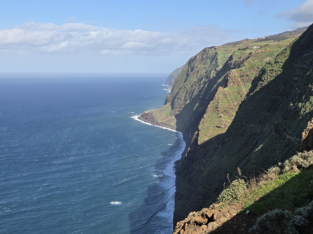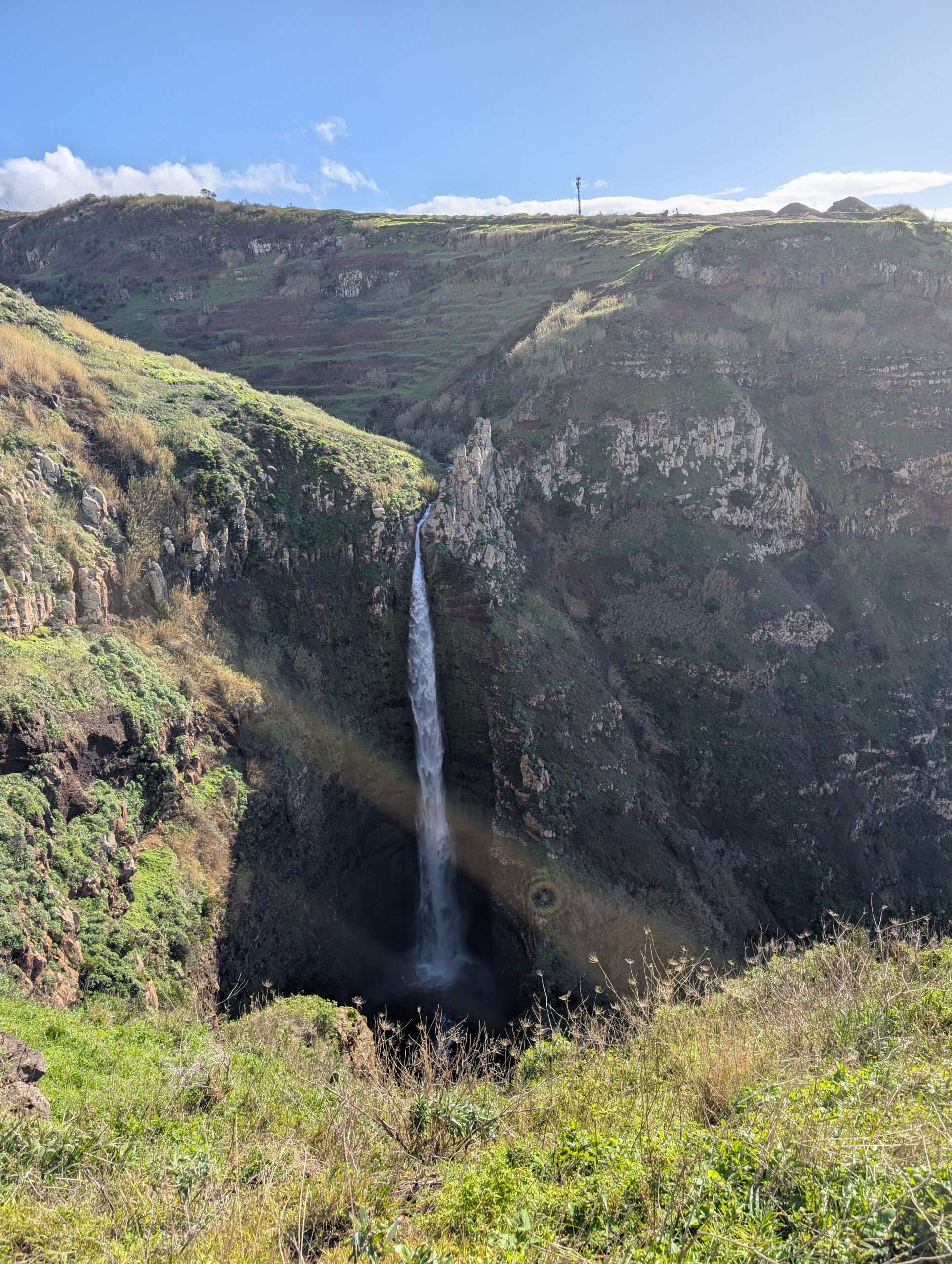 Und: Es gibt blauen Himmel! Sonnenschein! Dazu zwar eine steife Brise, aber da sind wir unkritisch. Zuerst geht es zum höchstgelegenen Leuchtturm Portugals, auf 312 Metern. Wir blicken Richtung Azoren und Kanada und bestaunen das aufgewühlte Meer. Dann, ebenfalls ohne echten Plan, nur wegen des Schildes, zum Aussichtspunkt Garganta Funda - mit 140 Metern Höhe einer der höchstgelegenen Wasserfälle der Insel. Auf dem Weg dahin wird eine Kuh geknuddelt, wir bewundern die Aussicht - langsam wird das was.