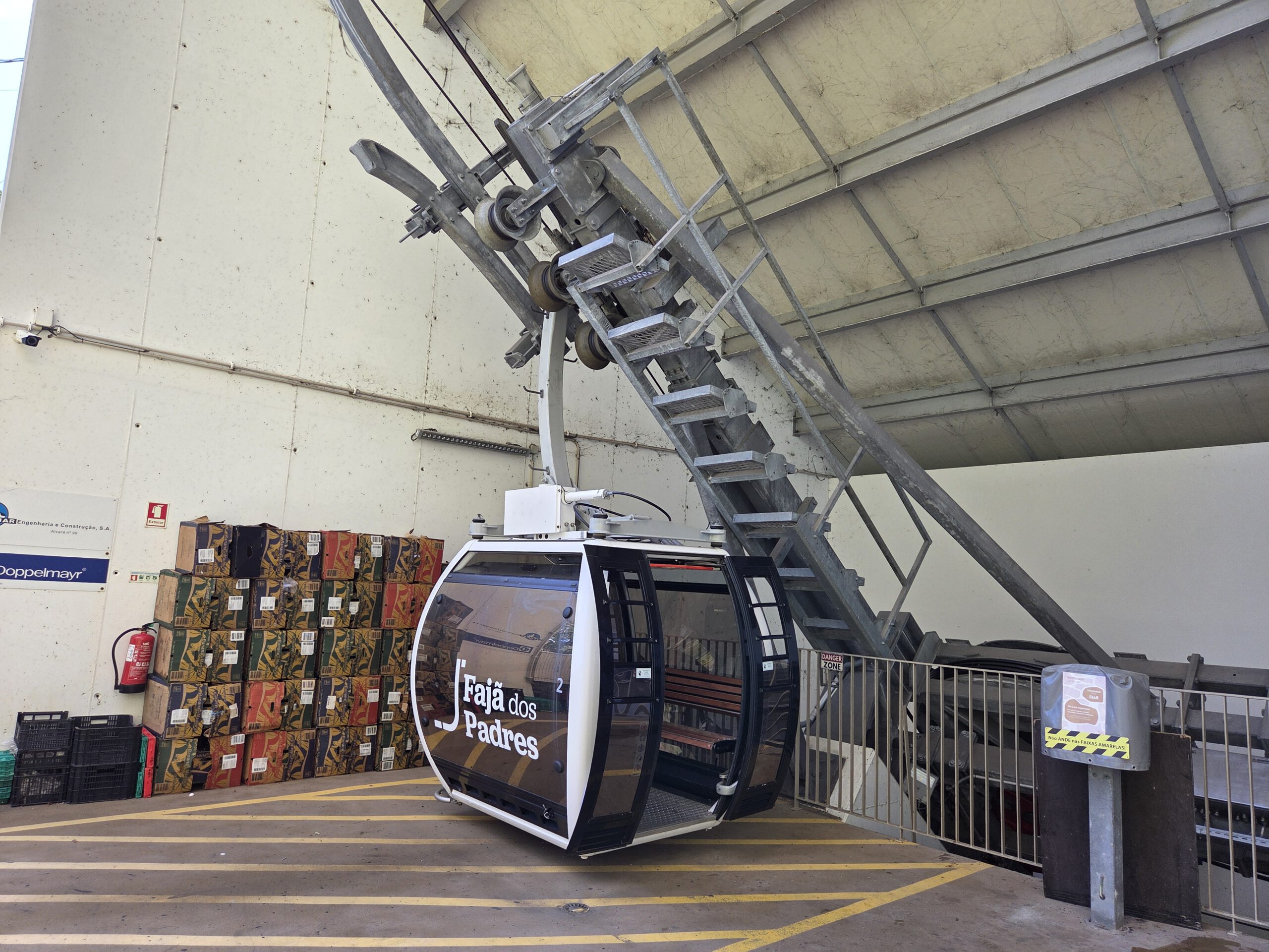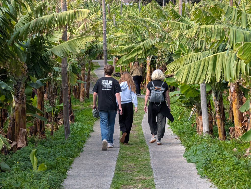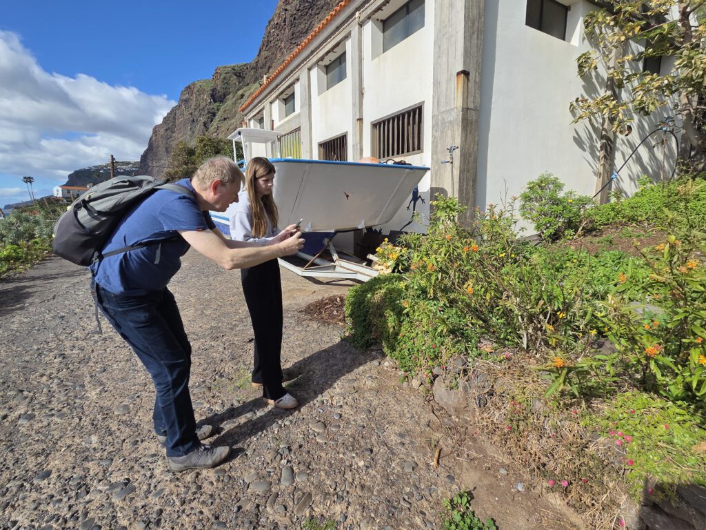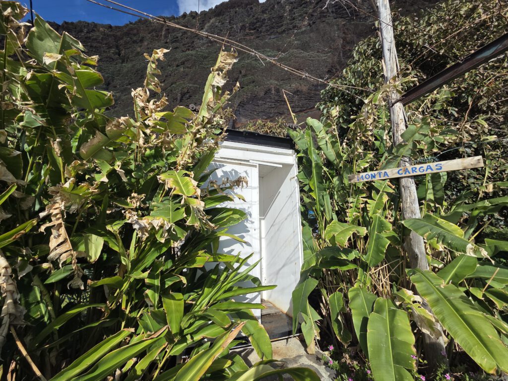 Dazu müssen wir wieder 30 Minuten an der Küste entlang Richtung Funchal fahren. Dann gibt es eine kleine, sehr steile Seilbahn an der Küste, die zu Faja dos Padros führt. Aber die Reiseleitung führt erstmal ein ausführliches Gespräch - natürlich wurde das alles am Vormittag digital gebucht, aber die Mailbestätigung kam irgendwie nicht. Wie gut, dass Nicole sich angewöhnt hat, sich selbst stets einen Screenshot zu schicken. Die Fachfrau ist erstaunt, dass wir etwas gebucht haben, schließlich ist sie ja für die Führungen zuständig. Aber irgendwo findet sich dann die Buchung und wir bekommen sogar eine exklusive Führung nur für uns vier. Allerdings dauert die Vorbereitung noch ein paar Minuten, da sie noch ein paar Früchte sammeln muss.