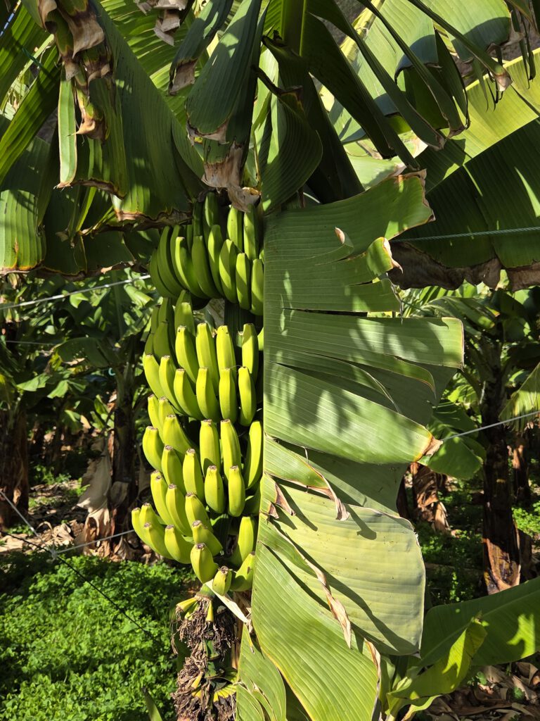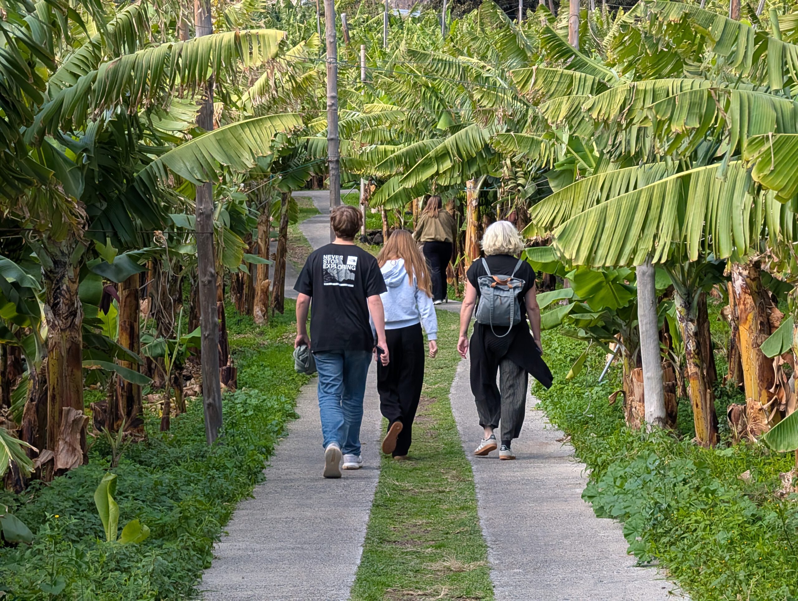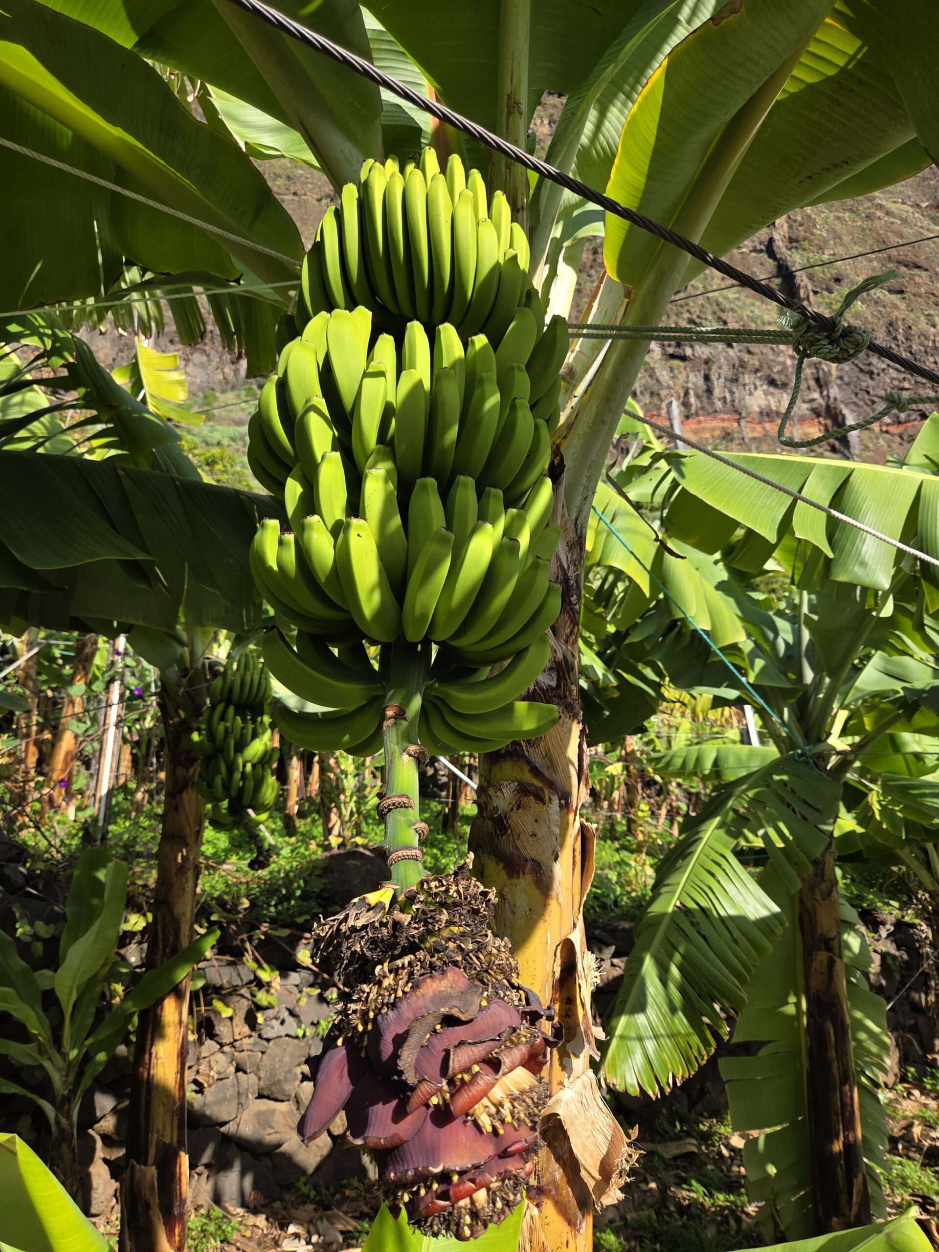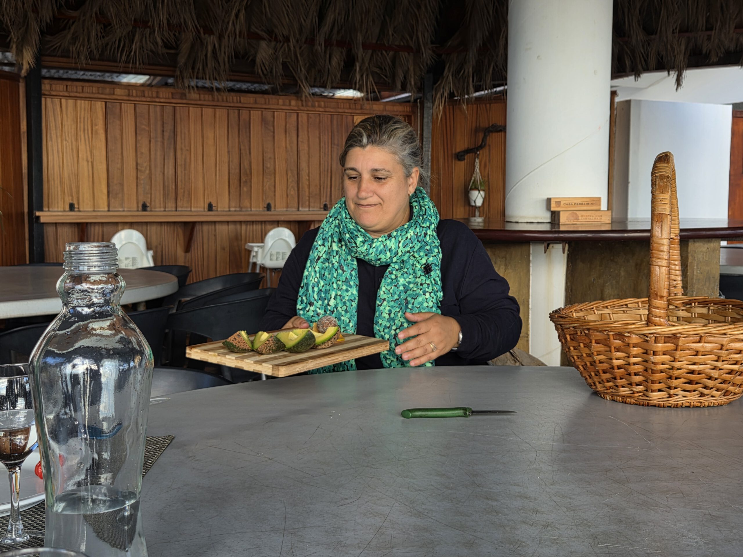 Dazu müssen wir wieder 30 Minuten an der Küste entlang Richtung Funchal fahren. Dann gibt es eine kleine, sehr steile Seilbahn an der Küste, die zu Faja dos Padros führt. Aber die Reiseleitung führt erstmal ein ausführliches Gespräch - natürlich wurde das alles am Vormittag digital gebucht, aber die Mailbestätigung kam irgendwie nicht. Wie gut, dass Nicole sich angewöhnt hat, sich selbst stets einen Screenshot zu schicken. Die Fachfrau ist erstaunt, dass wir etwas gebucht haben, schließlich ist sie ja für die Führungen zuständig. Aber irgendwo findet sich dann die Buchung und wir bekommen sogar eine exklusive Führung nur für uns vier. Allerdings dauert die Vorbereitung noch ein paar Minuten, da sie noch ein paar Früchte sammeln muss.