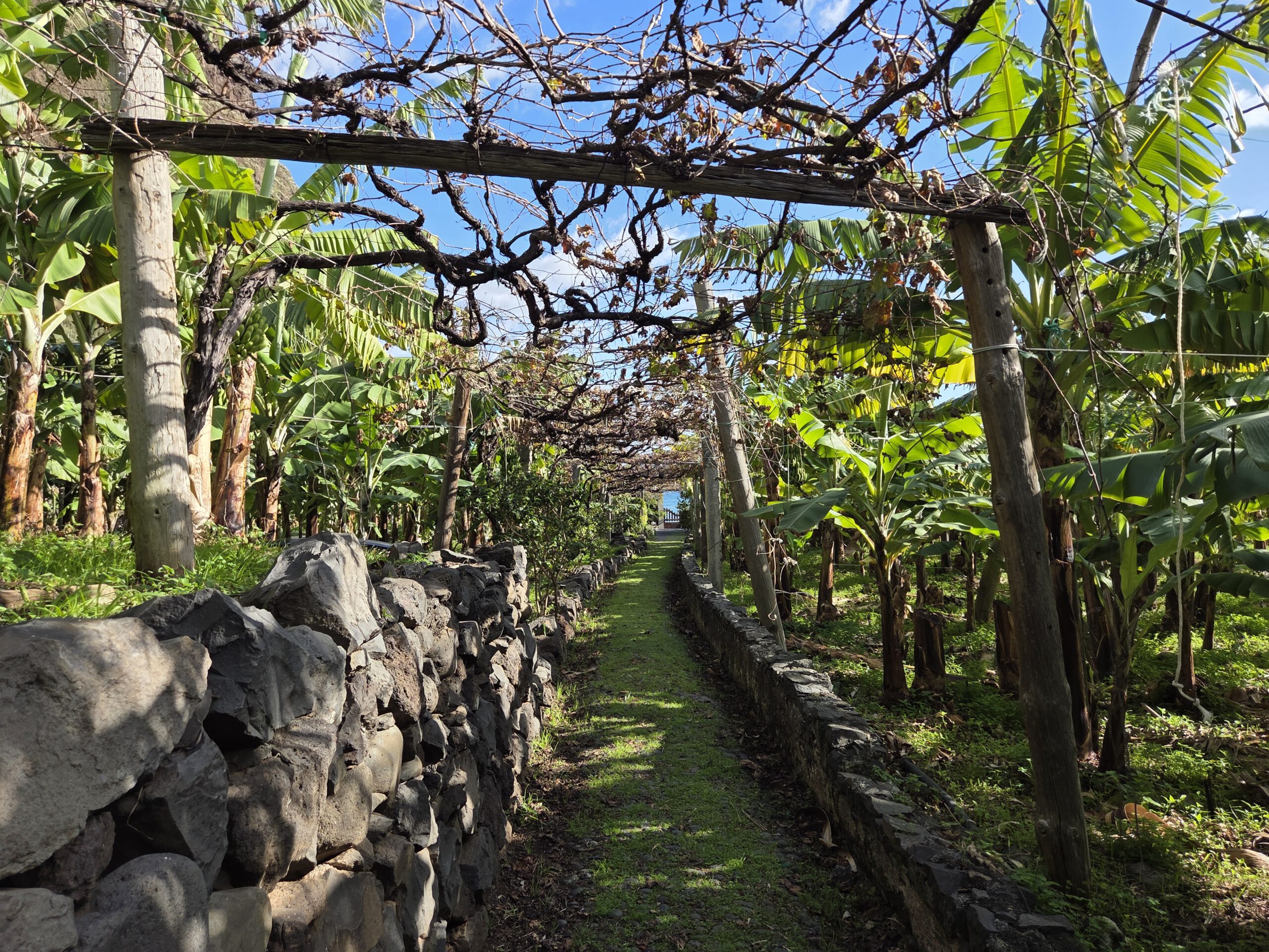 Die landwirtschaftlichen Flächen werden wohl seit 600 Jahren bewirtschaftet. Zwischendurch von den Jesuiten - daher der Name "Padros" - , bis diese vom König aus dem Land geworfen wurden. Seit 1921 gehört das Gelände einer Familie, der aktuelle Besitzer ist zwar Elektroingenieur, wurde aber auf einem Weingut groß. Daher fiel ihm irgendwann auch auf, dass wohl eine Rebe die Reblaus überlebt hat. Diese Rebe wurde analysiert und als richtig alt und wichtig für die Weinkultur befunden, die sogenannten Malvasia-Rebe. Sie wird jetzt, gepropft, wieder angebaut und der Wein für sehr teuer Geld verkauft.