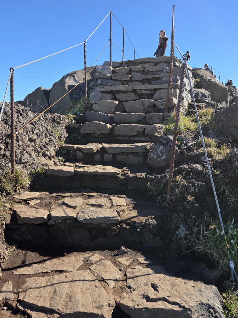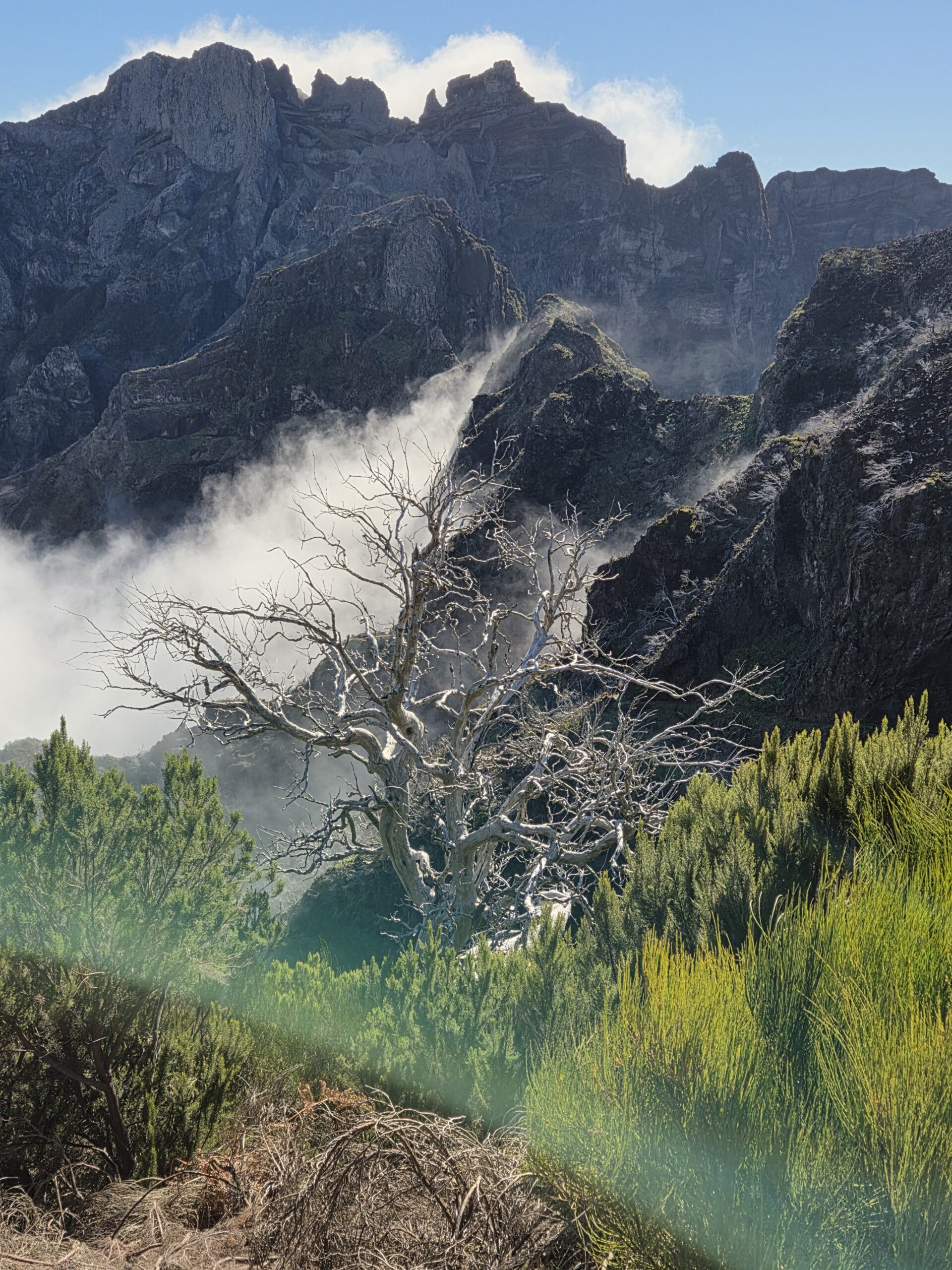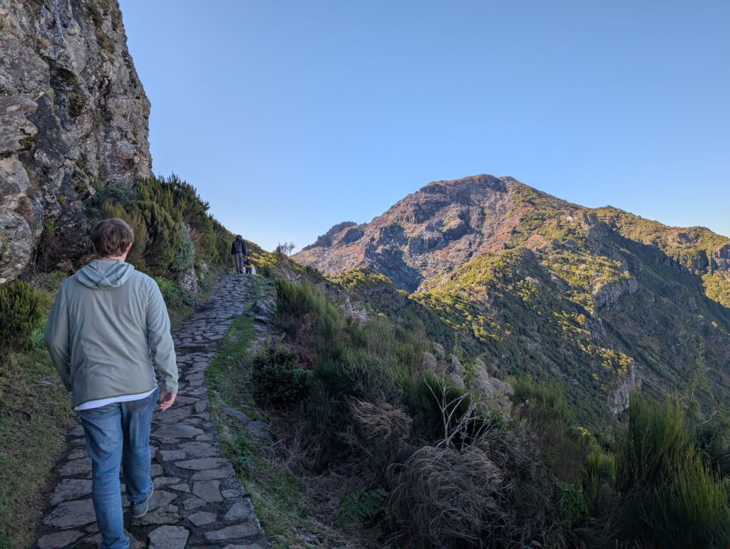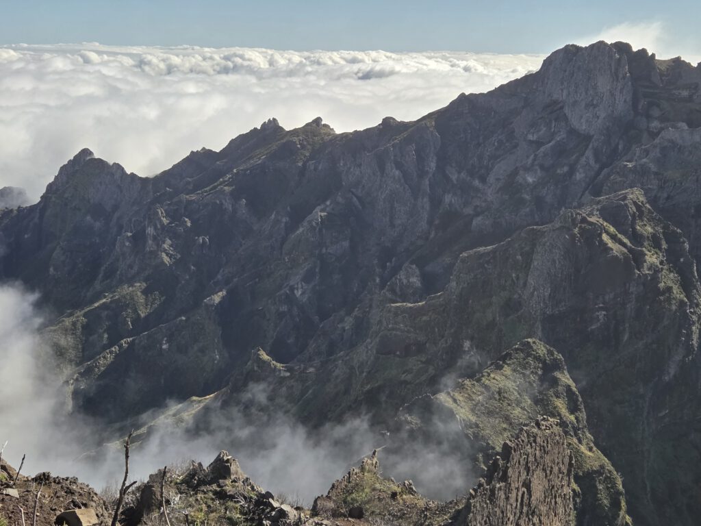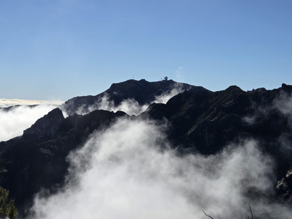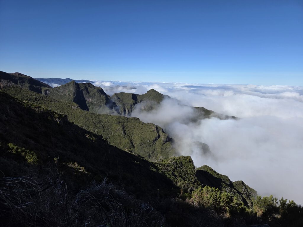 Der Weg ist nur 2,8 Kilometer lang, allerdings sind 400 Höhenmeter zu überwinden. Es ist viel los: Ein - vor allem deutsch-portugiesischer - Ameisentrail führt stetig bergan. Stellenweise künden eisige Stellen noch von einer kalten Bergnacht. Und nachdem auf der Fahrt nach oben noch dicke Wolken die Sicht verdeckten, reißt es jetzt auf: Wir sind über den Wolken, zeitweise gibt es sogar Sicht auf den Pico de Arieiro. Das Panorama ist sagenhaft und die Fotostopps eine gute Gelegenheit, zwischendurch mal tief Luft zu holen. A bisserl anstrengend ist der Aufstieg ja schon.
