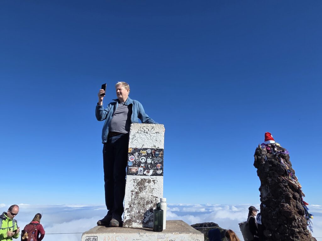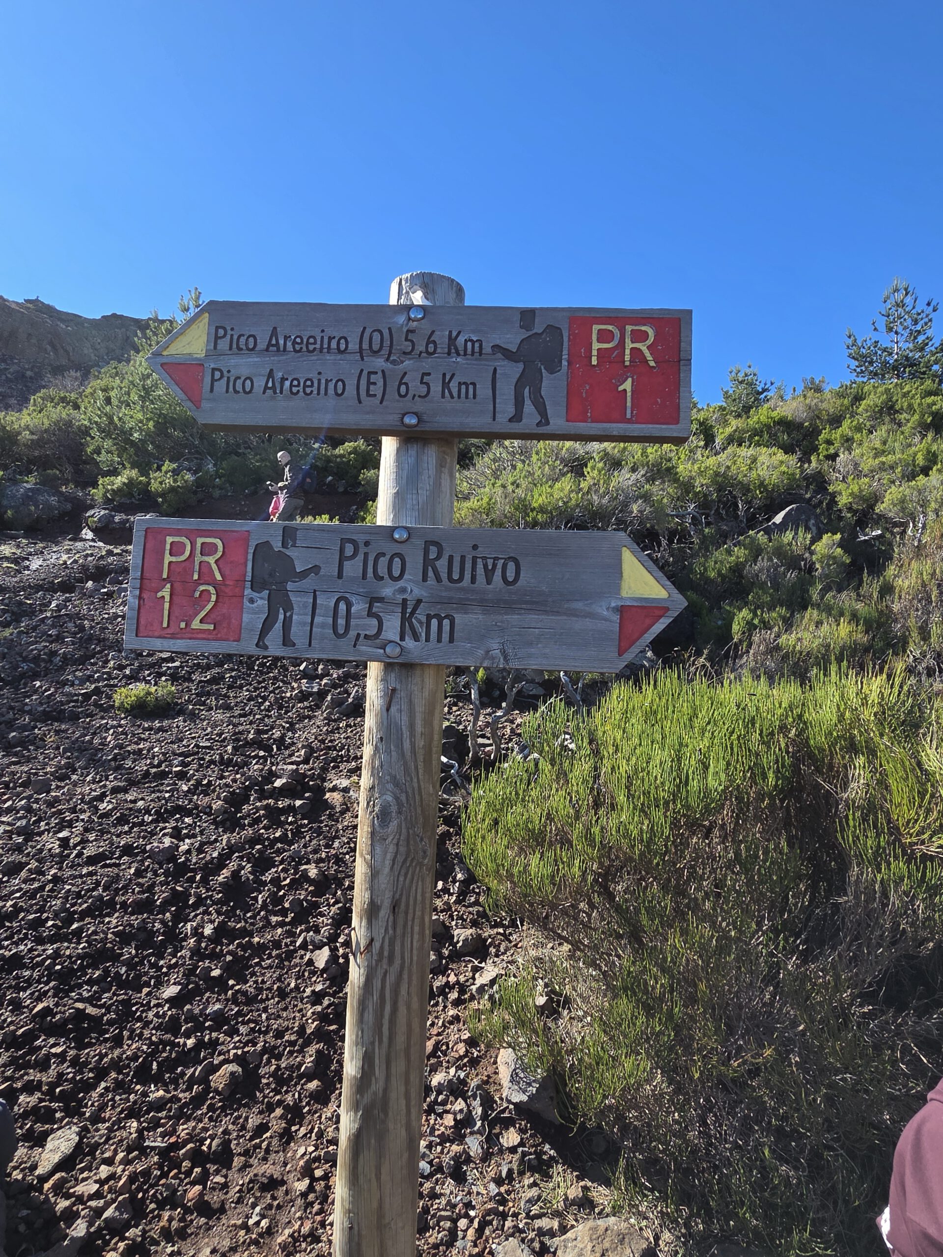 Der mit 1861 Metern höchste Berg der Insel befindet sich eineinhalb Stunden Fahrt entfernt. Aber die Wetterapp verspricht gute Sicht und so wagen wir es. Erst sieht es so aus, als wären kaum Wandererautos unterwegs. Doch dann kommen wir gar nicht bis zum Parkplatz Achado do Teixeira - die Fahrzeuge stehen schon am Straßenrand. Wir reihen uns ein und laufen schonmal ein Stück den Berg hoch. Beim Einstieg in den Weg stehen schon die Mitarbeiter der Behörde bereit, um geduldig bei der Registrierung in der neuen App, beim Buchen des Weges und der Bezahlung zu helfen. Geht dann doch recht zügig, kostet für uns vier 18 Euro (viermal 4,5 Euro) und los geht's.