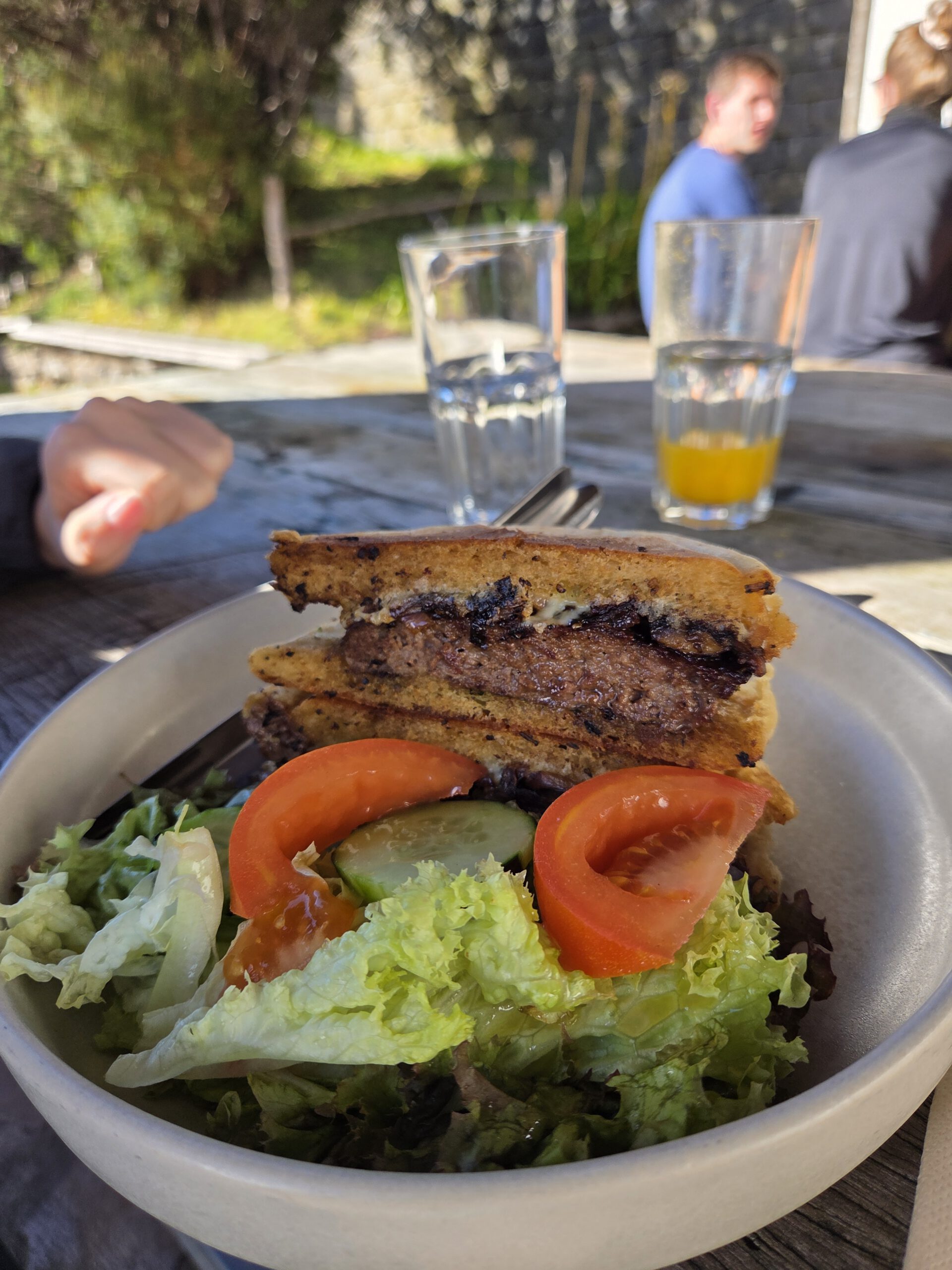 Um 13.30 Uhr sind wir auf dem Gipfel, die Sonne strahlt, der Geburtstagssohn auch. Wir bewundern ausgiebig die Aussicht, füttern die kleinen Vögel, lassen uns fotografieren und fotografieren andere Wanderer. Danach geht es wieder nach unten. Bis wir an Parkplatz und Einkehr sind, sind dort viele Autos schon weg. Es gibt spätes Mittagessen, mit Burgern und Quiche in der Sonne.