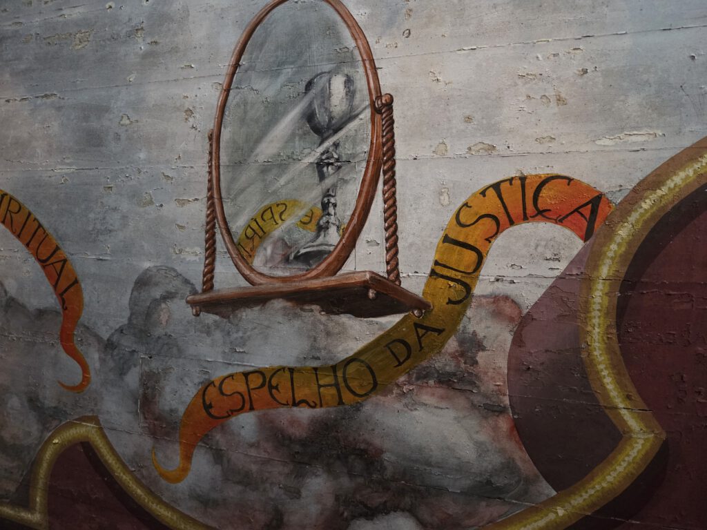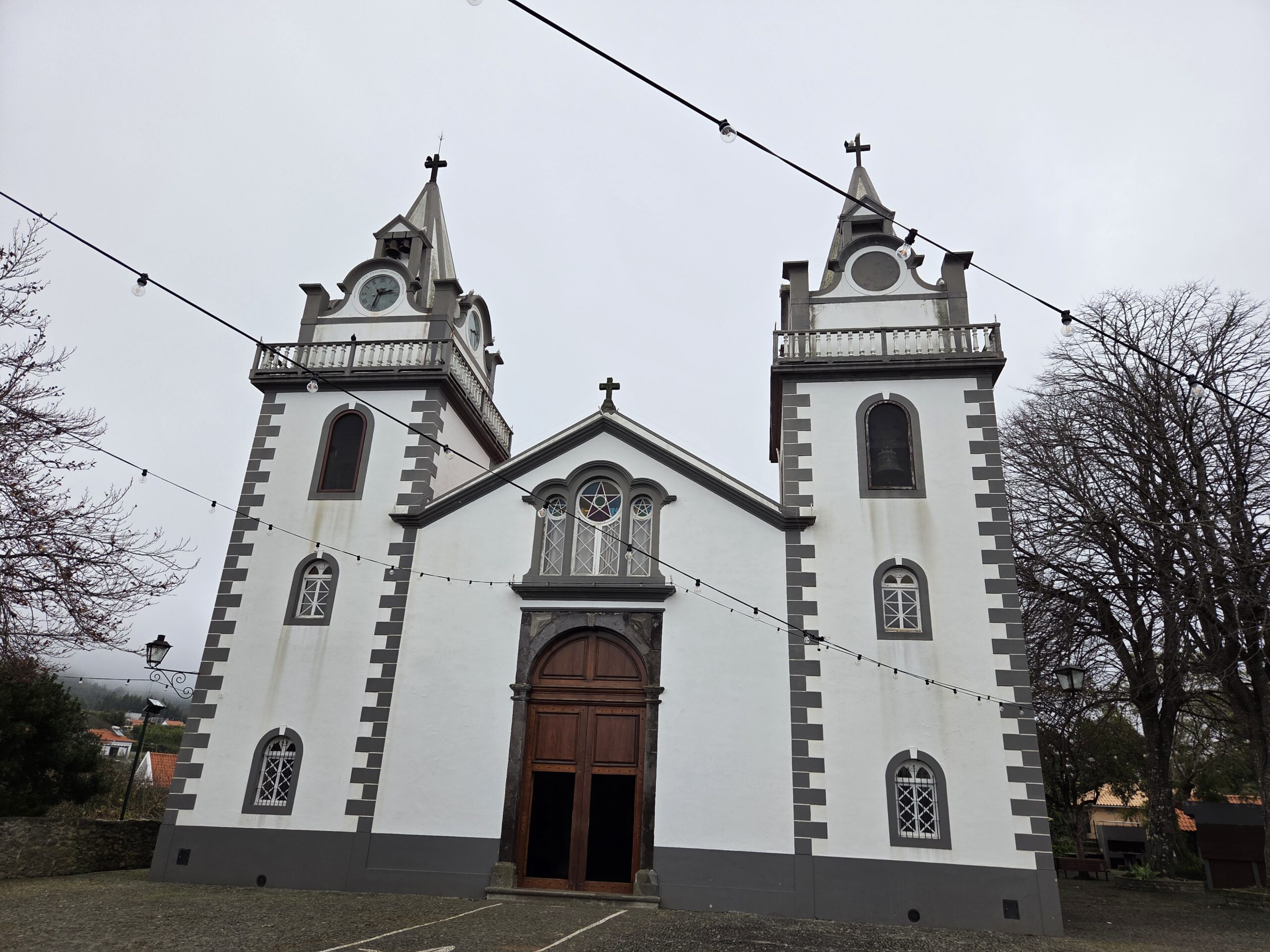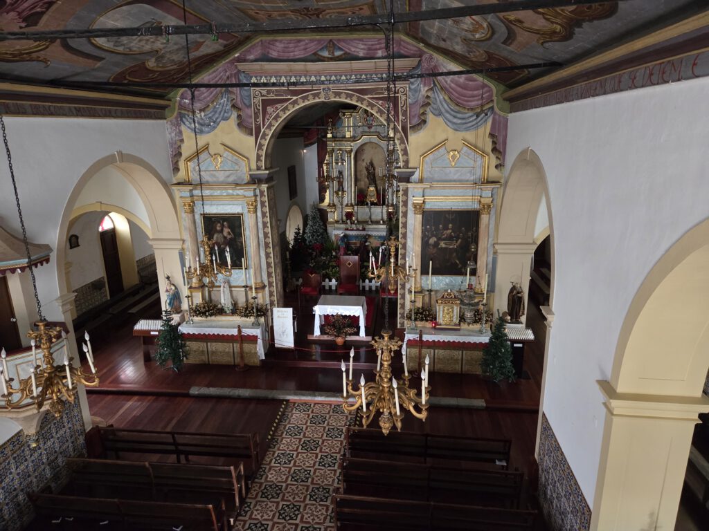Ein kühler, ruhiger Vormittag. Großes Frühstück mit Kühlschrankresten, denn irgendwie hatten wir noch viele Eier. Mathelernen, erstes Aufräumen. Kurz nach 12 Uhr sind wir unterwegs. Erstmal in die Kirche in Prazeres, bei der man in die Empore kommt und damit den Deckenmalereien ganz nahe. Nebenan pflegt die Kirchengemeinden einen großen Garten, es gäbe auch ein Team House, aber es sind alle sehr mit Aufräumarbeiten beschäftigt, da wollen wir nicht näher stören. Die öffentliche Toilette ist übrigens, wie immer, sagenhaft. Im kleinen Supermarkt nehmen wir noch ein paar Teilchen für unterwegs mit.