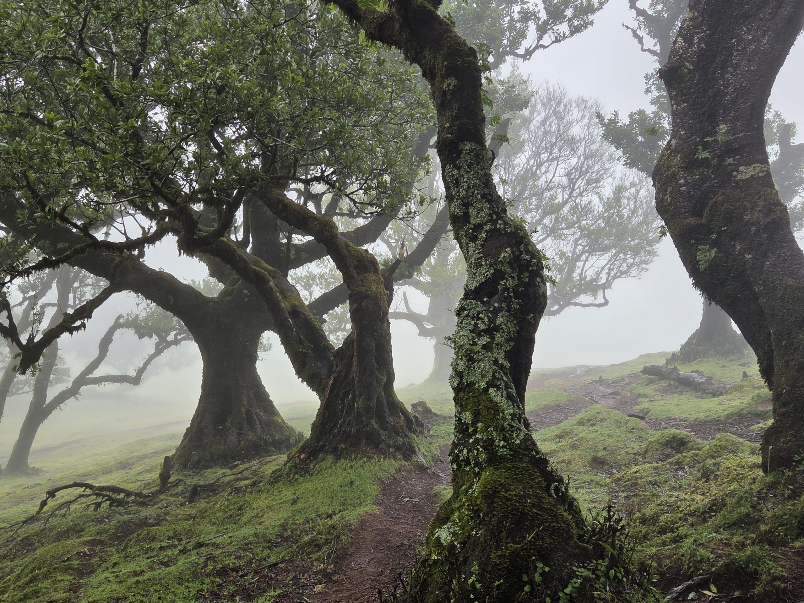 Am Anfang sind noch heitere Grüppchen unterwegs, immer wieder rutschen Wanderer im tiefen Matsch aus und landen im Schlamm. Wir schaffen es irgendwie, das zu vermeiden, auch wenn die Hosenbeine von Louisa und Nicole danach auch Spuren des Weges tragen. Aber dann wird es ruhiger, der Nebel bleibt dicht. Aber die Atmosphäre ist großartig und wir fotografieren sehr viele alte, knorrzige Bäume im Dunst. Wunderschöne Flechten hängen an den Ästen, Farne haben sich angesiedelt. Das gefällt uns sehr gut und hier gehört das Wetter ja ausnahmsweise auch mal hin. Gezahlt haben wir übrigens nix, gab ja keine Tafel mit QR-Code ... Aber alle Wege drumrum kosten natürlich.