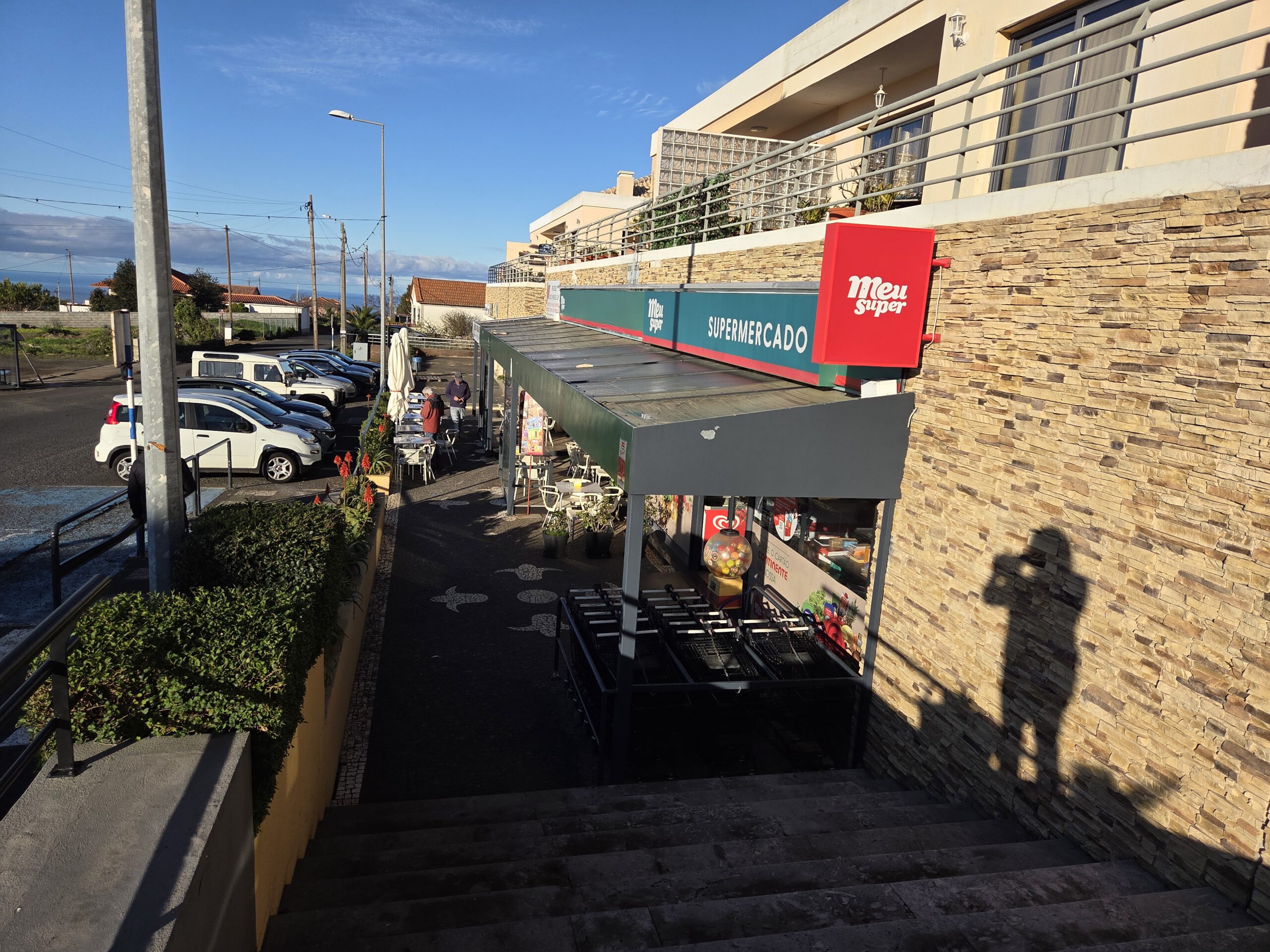 Ein wichtiger Programmpunkt: Shopping Madeira, eine große Einkaufsmall. Louisa ersteht einen schicken BH und ein Oberteil, vorher haben wir vom Parkdeck aus einen sagenhaften Sonnenuntergang gesehen. Im Supermarkt bringt uns eine hilfsbereite Portugiesin bis direkt zum Eierregal (das allerdings leer gekauft ist), weil sie findet, dass ihr Englisch viel zu schlecht für eine Wegerklärung ist (was nicht stimmt). Und, nach mehrfachen Nachfragen, schreibt Pedro, dass sein Vater das Kabel deponiert habe. Wir fahren also nochmal zu unserer ersten Unterkunft - und tatsächlich! Das Kabel liegt bereit.