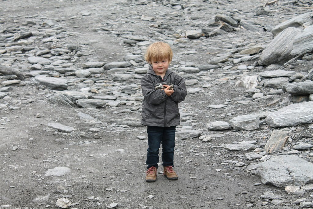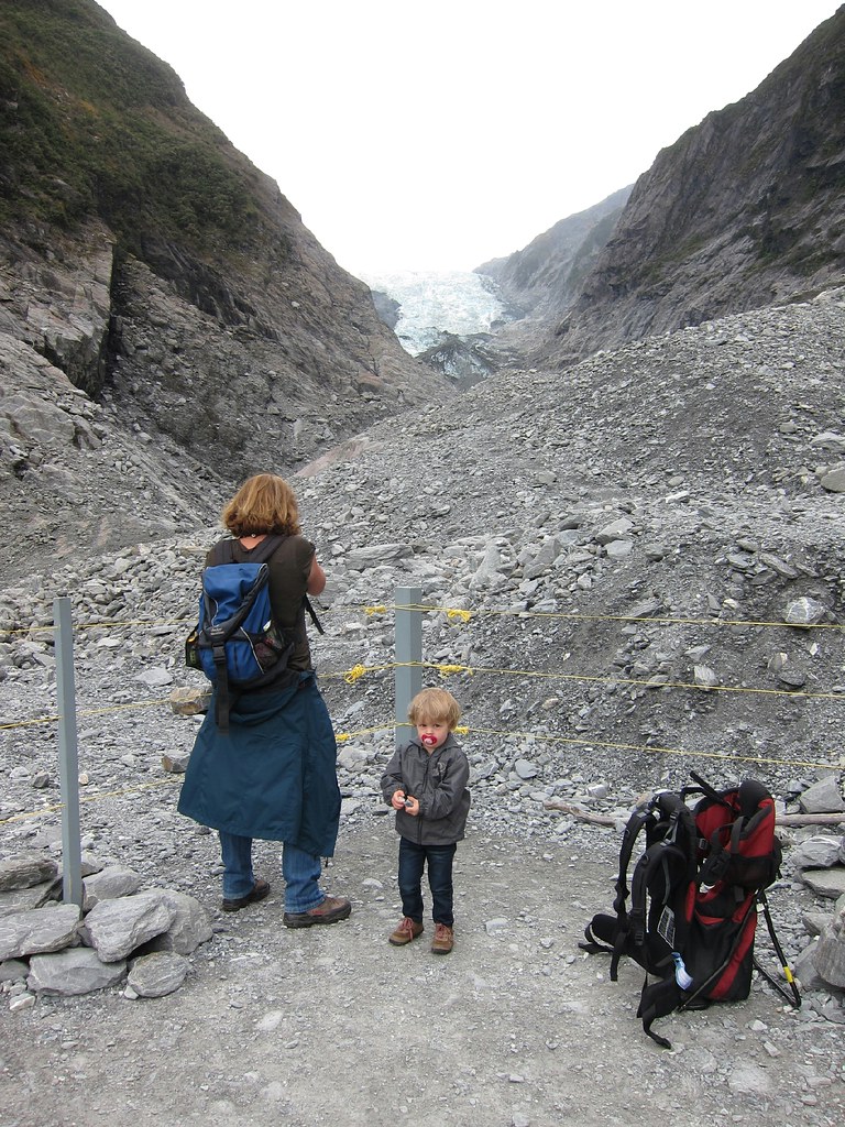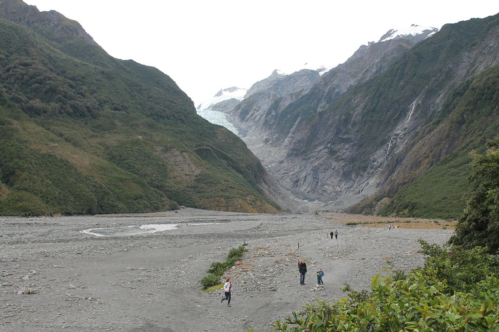 Im leichten Niesel erreichen wir den Franz-Josef-Gletscher. Dazu gehört ein sehr alpin anmutender Touri-Ort und ein hilfreiches Infozentrum. Dort kann man erfragen, ob man den Weg bei der Wetterlage unbeschwert gehen kann - können wir. Also parken wir unterhalb des Gletschers und machen uns auf den einstündigen Weg, der sich wegen der Steinbegeisterung unserer Kinder allerdings verdoppelt. Der Gletscher hat sich in den vergangenen sechs Jahren stark zurückgezogen. Wir laufen durch (klar) Regenwald und kommen dann in ein langgezogendes Flussbett.