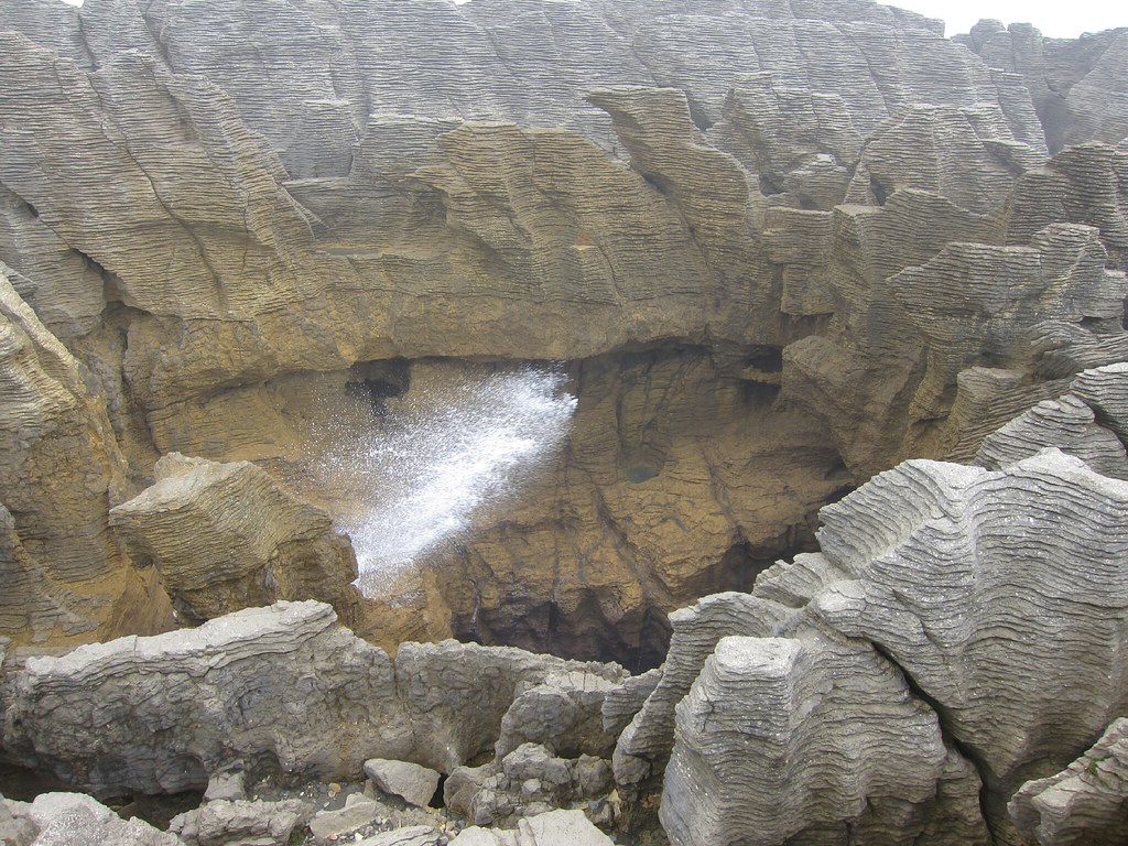 Der Weg geht an einem beeindruckenden Flusstal entlang. Das Wetter hält sich nur mäßig an den Bericht und tröpfelt vor sich hin. Dann haben wir Punakiki und die Pancake Rocks erreicht: Aufgrund der Sedimente im Gestein erodiert dieses in … gestapelter Pfannenkuchenform. Ein wie immer bestens ausgebauter Rundweg (für die ganzen Kiwis, die sowieso in jeder Lebenslage in Flipflops unterwegs sind) führt erst durch Farnregenwald, danach an die Küste. Von verschiedenen Aussichtspunkten aus kann man die gewellten Felsen bewundern. Es gäbe auch Blowholes, durch die das Wasser bei Flut nach oben schießt. Allerdings ist gerade Ebbe.