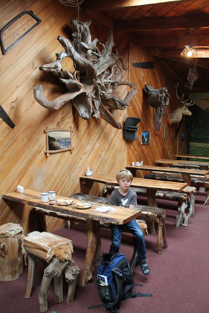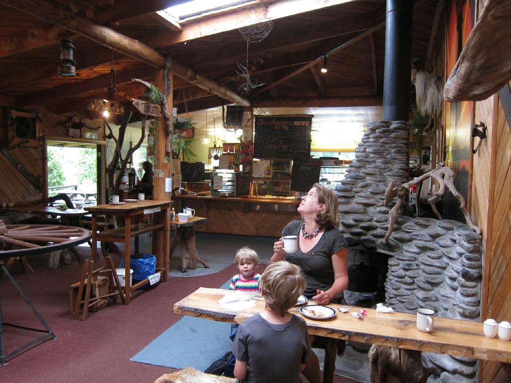 Nach dem Frühstück fahren wir im Nieselregen los. Ein Zwischenstopp: Der Buschmann Center in P. Dort gibt es angeblich legendäre Possum Pies. Possum? Das niedliche Tier, das unsere Kinder noch in Sydney gestreichelt haben? Genau. Denn in Neuseeland sind die beuteligen Possums eine Plage, zerstören Flora und Fauna und werden mit großem Aufwand gejagt. Nun sind die Possum Pies gerade vergriffen, es gibt Ärger mit der Regierung und überhaupt sind die beiden Betreiber des schrägen Ladens ein sehr streitbares Pärchen. (" Ein flat white ist für uns ein überfahrener Engländer. Bei uns gibt es einfach nur Kaffee"). Aber der Wildpie und die frisch gebackenen Scones sind lecker.