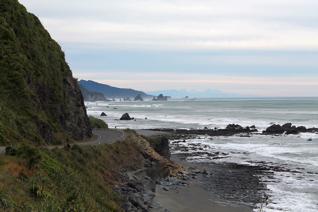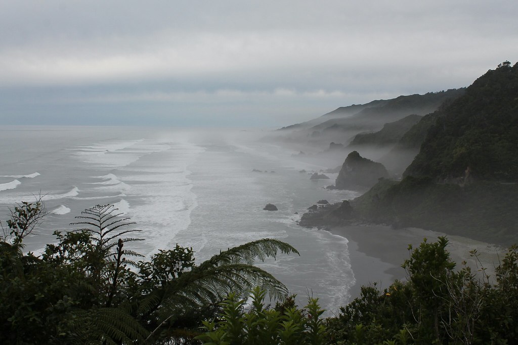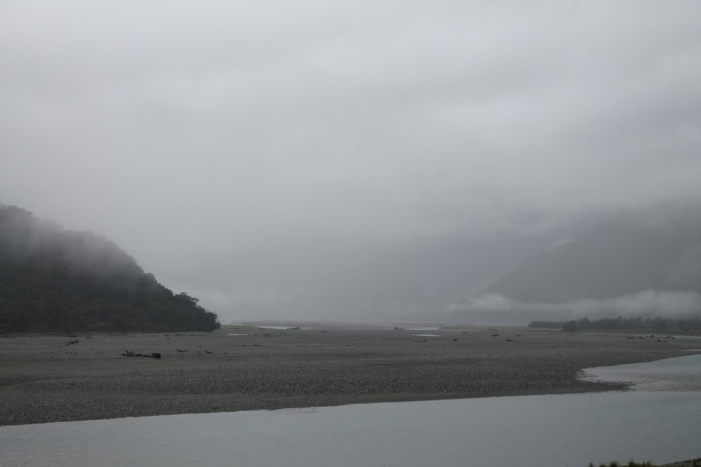 Der Morgen beginnt strahlend, doch dann besinnt sich das Wetter und hält sich strikt an die Vorhersage. Nach einem kräftigen Frühstück mit Ham & Eggs arbeiten wir uns abwechselnd durch Niesel, Schauer und Regen an der Küste entlang weiter nach Süden vor. Die Wolken hängen auf einmal sehr tief und da es phasenweise einfach nur schüttet, fahren wir am Fox Gletscher vorbei und lassen den See, in dem sich der Mount Cook bei schönen Wetter angeblich legendär spiegeln soll, einfach rechts neben der Straße liegen.