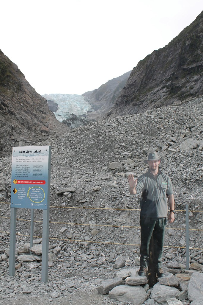 Langsam gehen wir Richtung Gletscher. Dann ist Schluss: Absperrungen. Markierungen. Warnungen, garniert mit Kopien der Zeitungsberichten über die Todesfälle unter Touristen, die es gewagt hatte, zu nahe ran zu gehen und denen ein Stück Gletscher auf den Kopf gedonnert ist. Also man kann den angelsächsichen Behörden nun wirklich nicht vorwerfen, dass sie einen nicht umfassend informieren… oder wie war nochmal das andere Wort für Panikmache? Uns leichtsinnigen Europäern kommt das alles ziemlich überzogen vor und Gerald wirft noch einen sehr sehnsüchtigen Blich Richtung Gletscher. Aber dann treten wir langsam den Rückweg an. Wir hatten Glück und für die kleine Wanderung direkt eine Regenpause erwischt. Für morgen, Montag, ist Starkregen gemeldet - und dann wollten wir wirklich nicht in den Flussbett herumstolpern.