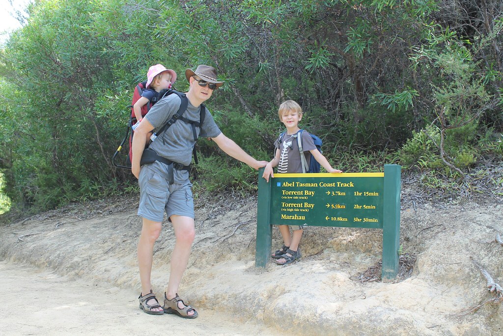 Am absoluten Traumstrand angekommen, stellen wir dann tatsächlich fest, dass wir mehr Weg vor uns haben, als gedacht: Wir hatten mit lockeren drei Stunden gerechnet. Das Schild weist uns darauf hin, dass 12,5 Kilometer auf uns warten, die mit 4 Stunden angegeben sind … Der Track selbst ist breit ausgebaut wie ein Highway und für Erwachsene nicht mehr, als ein langer, aber ganz einfacher Spaziergang. Zwar am Anfang steil den Hügel hoch, aber grundsätzlich gut zu gehen. Kilian hingegen hat nun einfach kürzere Beine und Louisas Geduld in der Kraxe ist … wechselnd.
