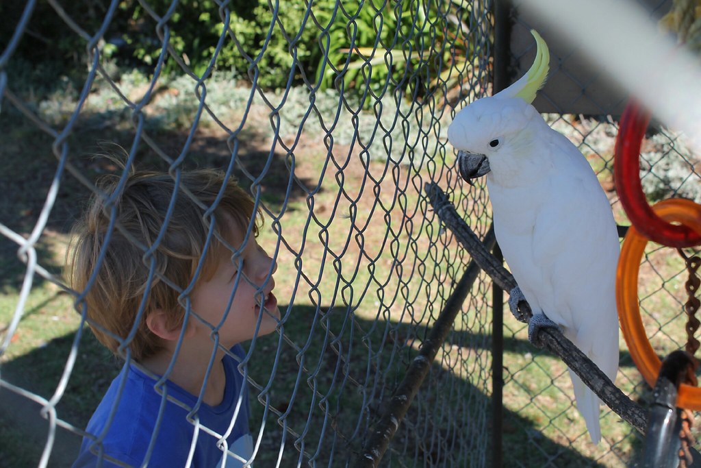 In Ruhe auf den Fluss gucken, gemütlich zusammenpacken. Louisa erklären, dass Steinwürfe auf Autos nicht gut sind. Kilian von Joeys Käfig loseisen: Seit Australien ist Kilian inoffizielles Mitglied im Kakadu-Fanclub, würde gerne einen Kakadu haben und klebt natürlich am Käfig des zeltplatzeigenen Kakadus Joey. Nachdem er noch etwa 20 Abschiedsfotos vom Vogel knipsen durfte, steigt er doch ein.